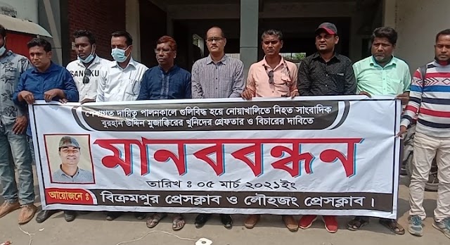 মুন্সীগঞ্জে  সাংবাদিক মুজাক্কির হত্যার বিচারের দাবিতে মানববন্ধন অনুষ্ঠিত
